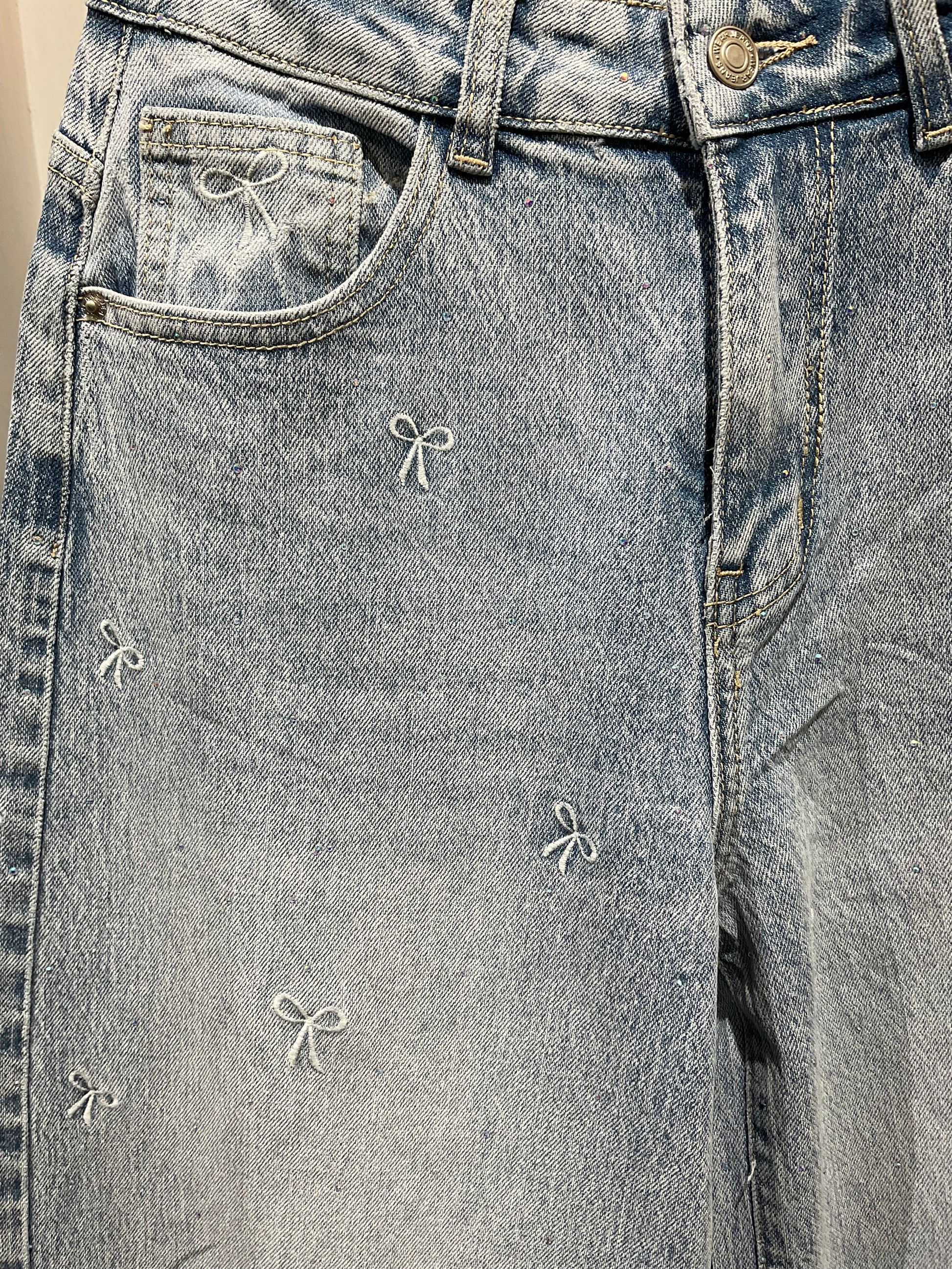 Jeans ricamato lavaggio chiaro largo in fondo.